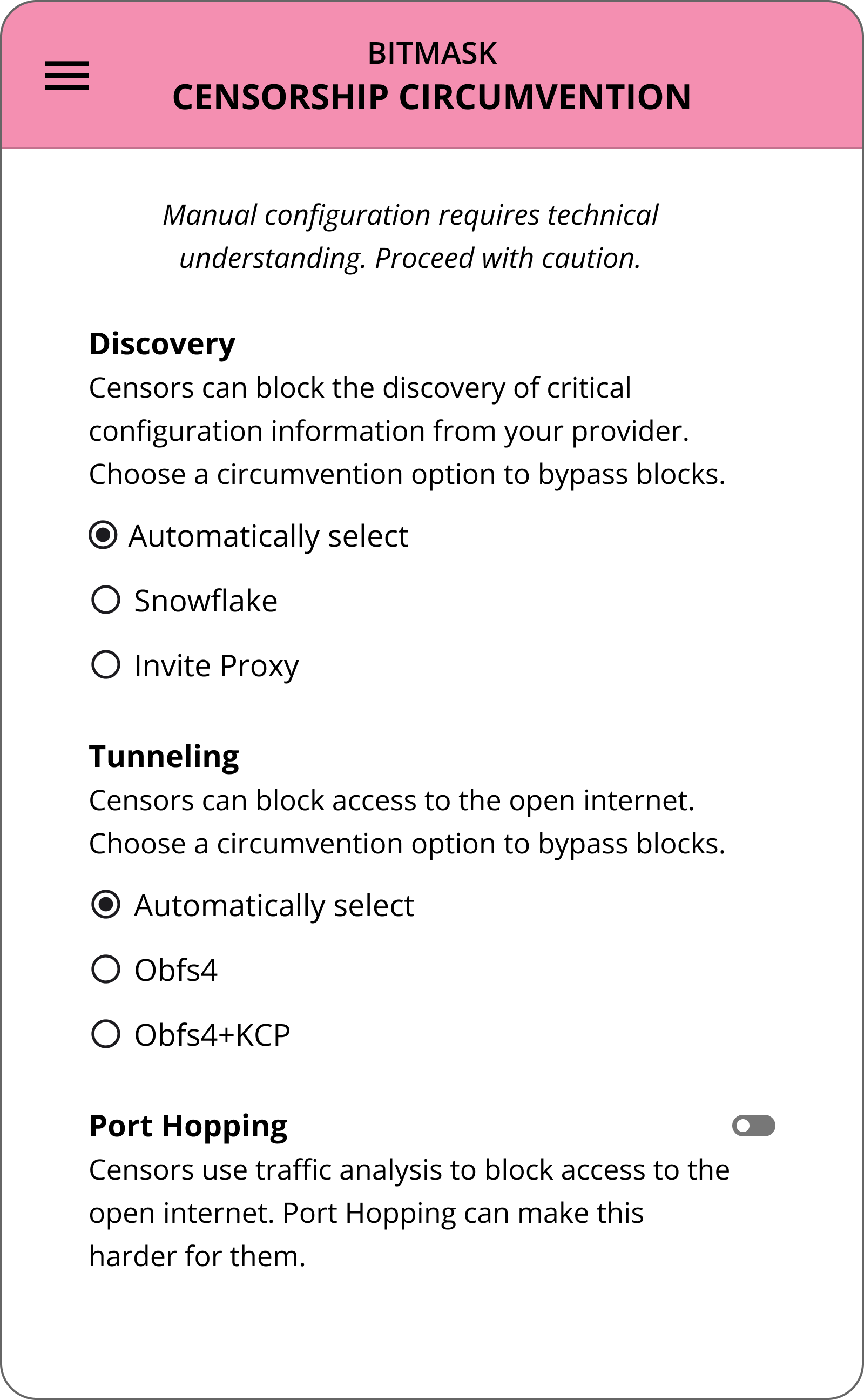 Information drives politics and culture, and those who control its flow hold the power to shape what people believe. That’s why authoritarian regimes erect digital firewalls and restrict access to the open internet. Bitmask includes built-in tools to evade these controls, and the system behind it is self-hostable. Individuals or collectives can run their own private, circumvention-focused VPNs. Connect to one using a discreet URL or invite code, and you can bypass censorship.